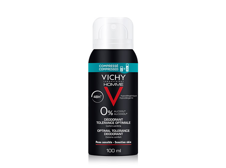 Le 1er déodorant 48h hypoallergénique 0% alcool dans un spray compressé par Vichy.