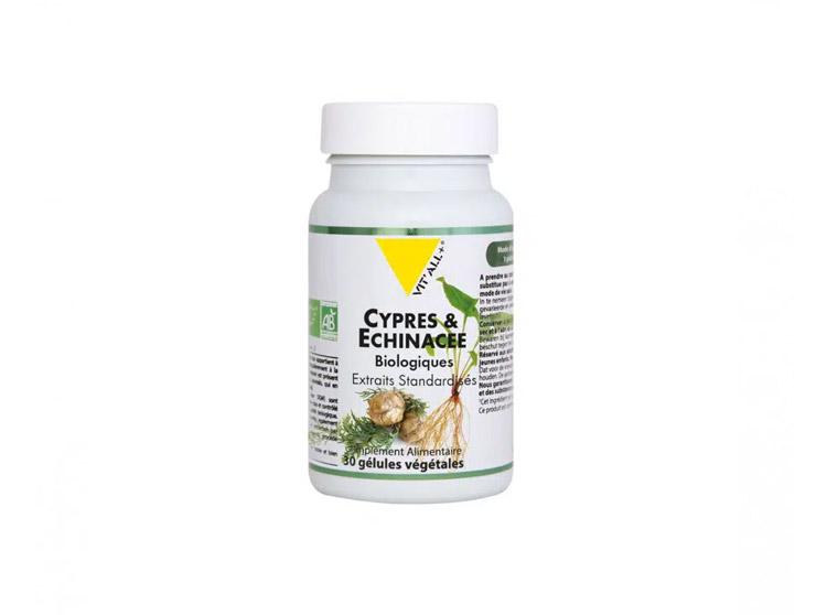 Le Complexe biologique CYPRES & ECHINACEE associe un extrait de noix de cyprès récoltées à la main en France à un extrait français de racine d’échinacée pourpre standardisés en actifs.