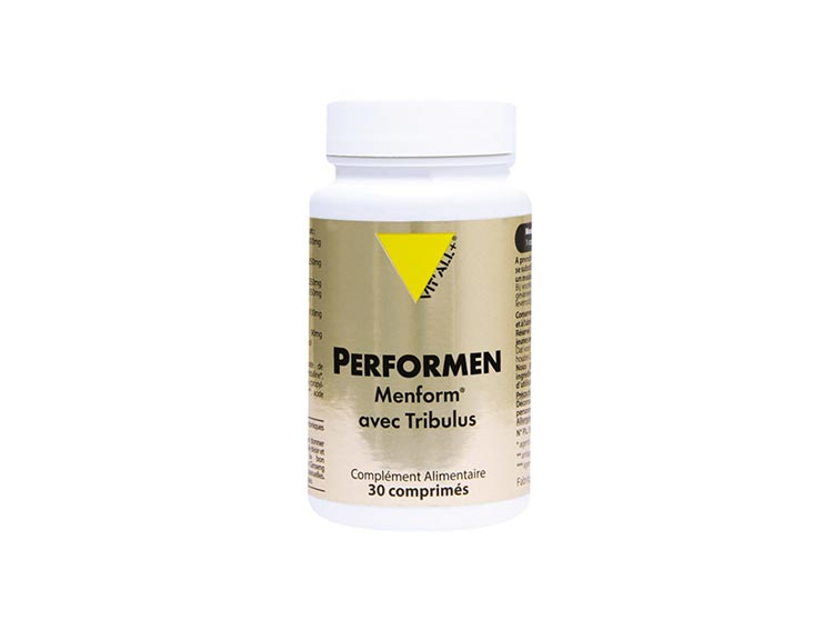 Le performen est un complexe orthomoléculaire spécifiquement formulé pour soutenir les performances masculines. Il associe 6 extraits standardisés de plantes toniques pour l'homme à de l'arginine et des nutriments hautement biodisponibles. Liboost est un extrait breveté de damania aux propriétés aphrodisiaques. Il a fait l'objet d'une étude qui a confirmé son action positive sur les capacités sexuelles masculines. Le tribulus contribu au désir sexuel, avec l'ashwagandha il participe aux bonnes fonctions sexuelles masculines. L'ashwagandha est une plante adaptogène et tonique contribuant au bien-être physique et mental. Elle aide à maintenir une endurance optimale, une sensation d'énergie et de vitalité. Elle soutient également la prise de masse musculaire. Le zinc et le tribulus aident à maintenir un taux normal de testostérone dans le sang. Les vitamines B5 et B6 contribuent à réguler l'activité hormonale. Le zinc contribue à une fertilité normale. Les vitamines B3, B5 et B6 contribuent à réduire la fatigue.