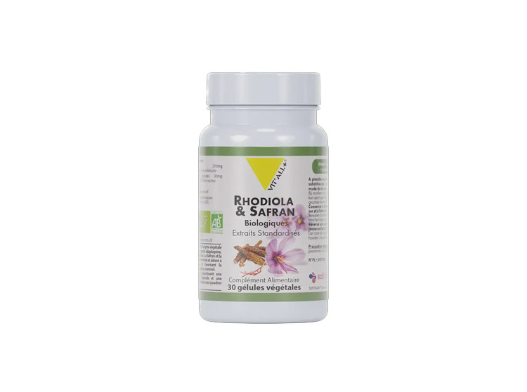 Rhodiola rosea – racine – Extrait Standardisé à 3% de Rosavines et 1% de Salidroside - Safran (Crocus sativus L.) – partie rouge des stigmates – Safr’InsideTM – Extrait Standardisé à 2 % de Safranal et 3% de Crocine – Biologique1