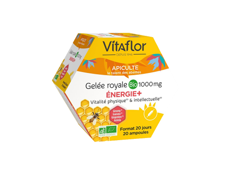 Vitaflor Gelée royale ÉNERGIE+ aide à renforcer la vitalité grâce au ginseng, contribue à la réduction de la fatigue mentale grâce au guarana et soutient les défenses immunitaires de par l'action du gingembre.