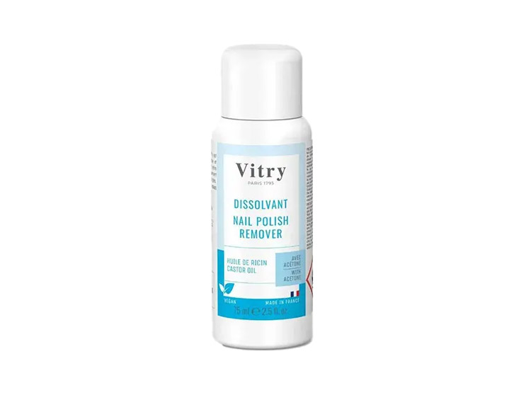Le dissolvant avec acétone de la marque Vitry permet de retirer le vernis à ongles efficacement en douceur, même les plus résistants.
